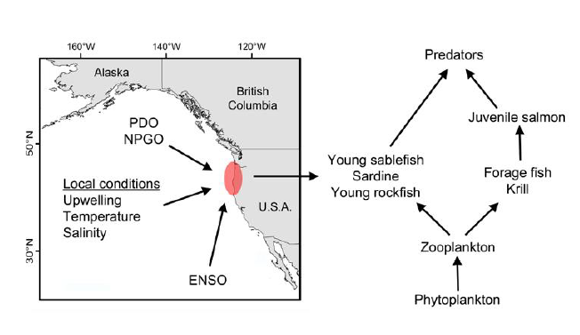 Figure 25. Illustration of how basin-scale and local-scale physical forces influence the northern California Current and resultant food web structure. PDO = Pacific Decadal Oscillation. NPGO = North Pacific Gyre Oscillation. ENSO = El Nino-Southern Oscillation (Peterson et al., 2015)