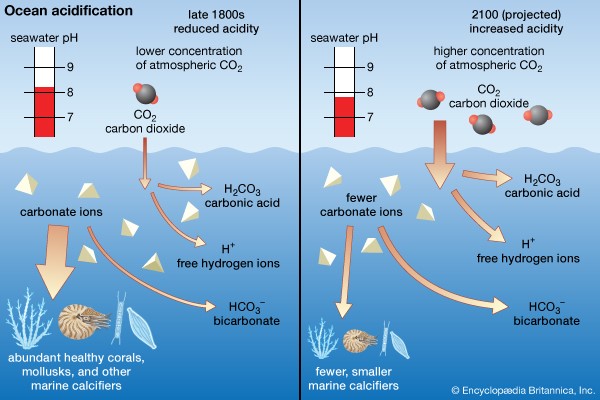 Figure 26. Conceptual diagram comparing the state of carbonate ions in the ocean under the lower-acid conditions of the late 1800s and the higher acid conditions expected in 2100 (https://www.britannica.com/story/ocean-acidification-how-carbon-dioxide-is-hurting-the-seas)