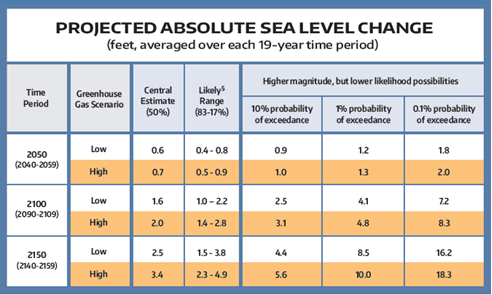 Table 2. Absolute sea level rise projections, in feet, for Washington State. Projections are expressed in terms of the “probability of exceedance” for three different time periods (2050, 2100, 2150) and two different greenhouse gas Scenarios (RCP 4.5 [low], and RCP 8.5 [high]). Projected changes are assessed relative to contemporary sea level, defined as the average sea level over the 19-year period from 1991-2009. Projections for 2050 and 2100 under the high greenhouse gas scenario (RCP 8.5 – highlighted below) are also shown in Figure 20 below (Miller et al. 2018).