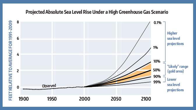 Sea levels around the Puget sound have risen by about 8 inches since 1900 (NRC, 2012; figure 19). As the climate changes sea level rise is expected to accelerate. Predicting future sea level rise is a complicated, probabilistic science. Due to uncertainty in the rate that the Greenland and Antarctic ice will melt, predictions of sea level rise are highly variable.