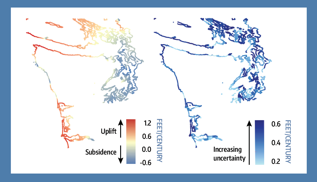 Figure 21. Vertical land movement best estimate rates (left) expressed in feet per century and their uncertainties (1 standard deviation, right) as estimated for Washington’s coastline (Miller et al. 2018).