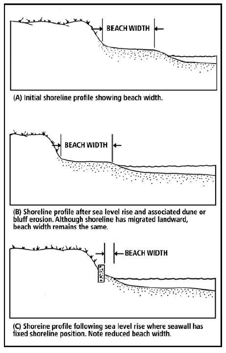 Sea level rise has major implications for the human population, which has built cities along the shores of the Puget Sound. Effects on salmon are less direct, but they are significant and many are associated with human responses to sea level rise. Like flooding, the usual human responses to sea level rise are bad for salmon. The typical response is to armor beaches and waterfronts with sea walls to prevent erosion and direct wave energy away from the shore and the toes of bluffs. These approaches squeeze nearshore habitat for salmon and other prey species they depend on the beach between rising seas and armored shorelines (Figure 22).