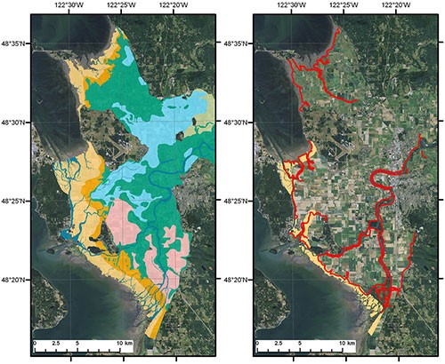 Figure 23. Aerial photograph of the Skagit River delta, in the Puget Sound area of Washington, illustrating changes between 1850 (left) and 2010 (right). In 1850 the delta included extensive wetlands providing important habitat for salmon spawning (orange). By 2010 most of the delta had been “reclaimed” for development by a system of dikes and levees (red), greatly reducing the habitat available to salmon. Left: courtesy of Brian Collins, University of Washington. Right: Eric Grossman, USGS. (https://walrus.wr.usgs.gov/climate-change/lowNRG.html)
