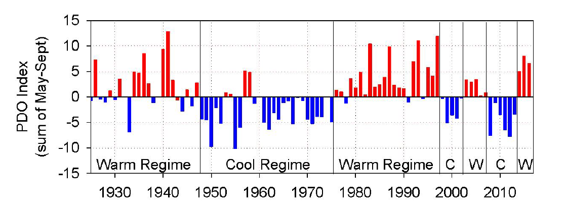 There are a few large scale climate cycles that naturally influence ocean conditions in the North Pacific, including the Pacific Decadal Oscillation (PDO), the North Pacific Gyre Oscillation (NPGO), and the El Nino Southern Oscillation (ENSO). These interacting and overlapping oscillations in water temperature and pressure systems influence ocean currents, air and water temperatures, plankton assemblages and distributions, upwelling patterns, and marine survival rates of salmon. PDO, referred to as having warm and cold years, is correlated with salmon survival (Mantua et al. 1997; Figure 24).